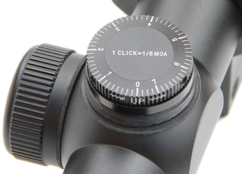 - Klickverstellung: 1 Klick = 1/8 MOA = 1,85 mm auf 50 m, 3,7 mm auf 100 m